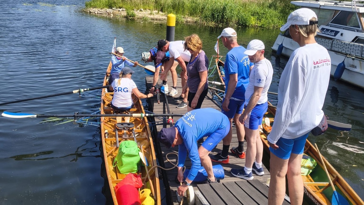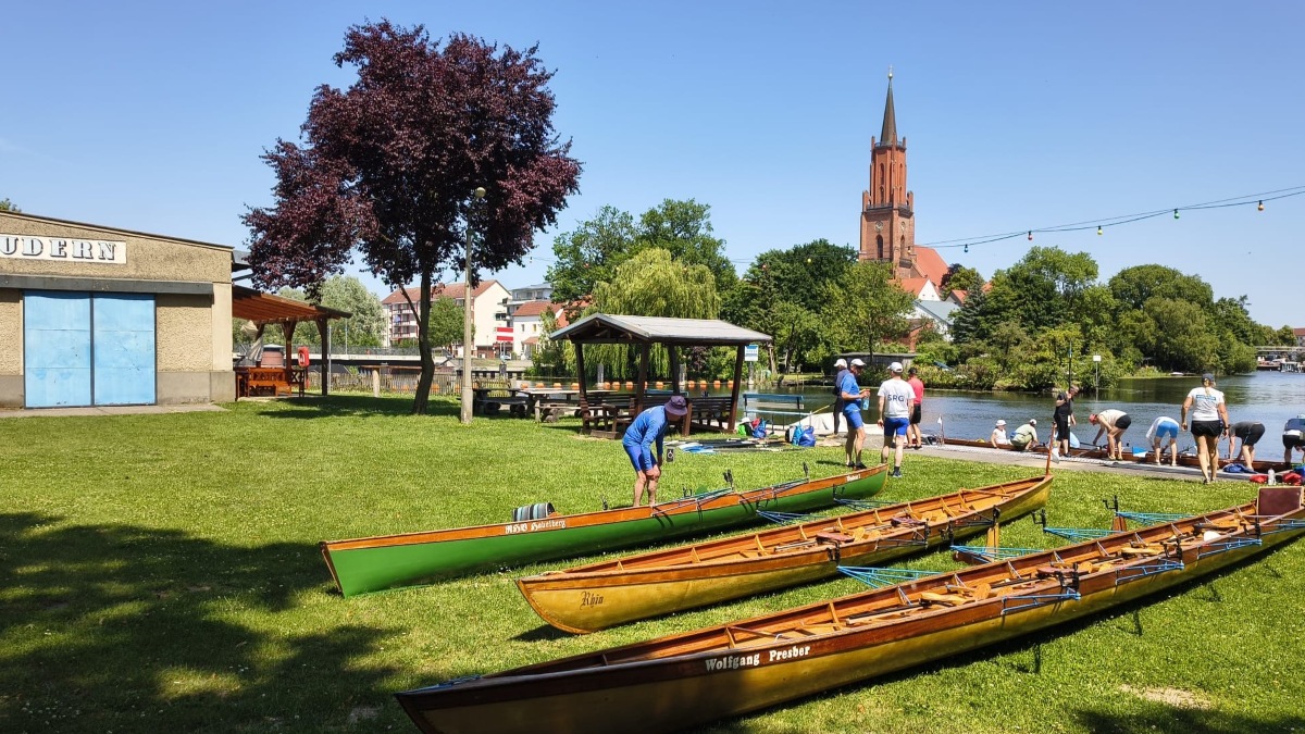 Es dauert wieder ein bisschen, bis am Samstagmorgen alle Boote startklar sind. Wir rudern durch den „verlängerten Blinddarm“ und nehmen Kurs auf Rathenow. Die Stadt an der Havel mit über 800-jähriger Geschichte ist als Wiege der Optik in Deutschland bekannt. Heute sieht man davon nicht mehr viel. Wir verlassen die Havel und rudern auf dem Stadtkanal, an dem noble Häuser mit großen Gärten liegen, die sich zum Wasser öffnen. Die Strecke bis zur Stadtschleuse zieht sich ebenfalls. Die Sonne scheint, die Luft drückt. Wasservorräte werden weniger.